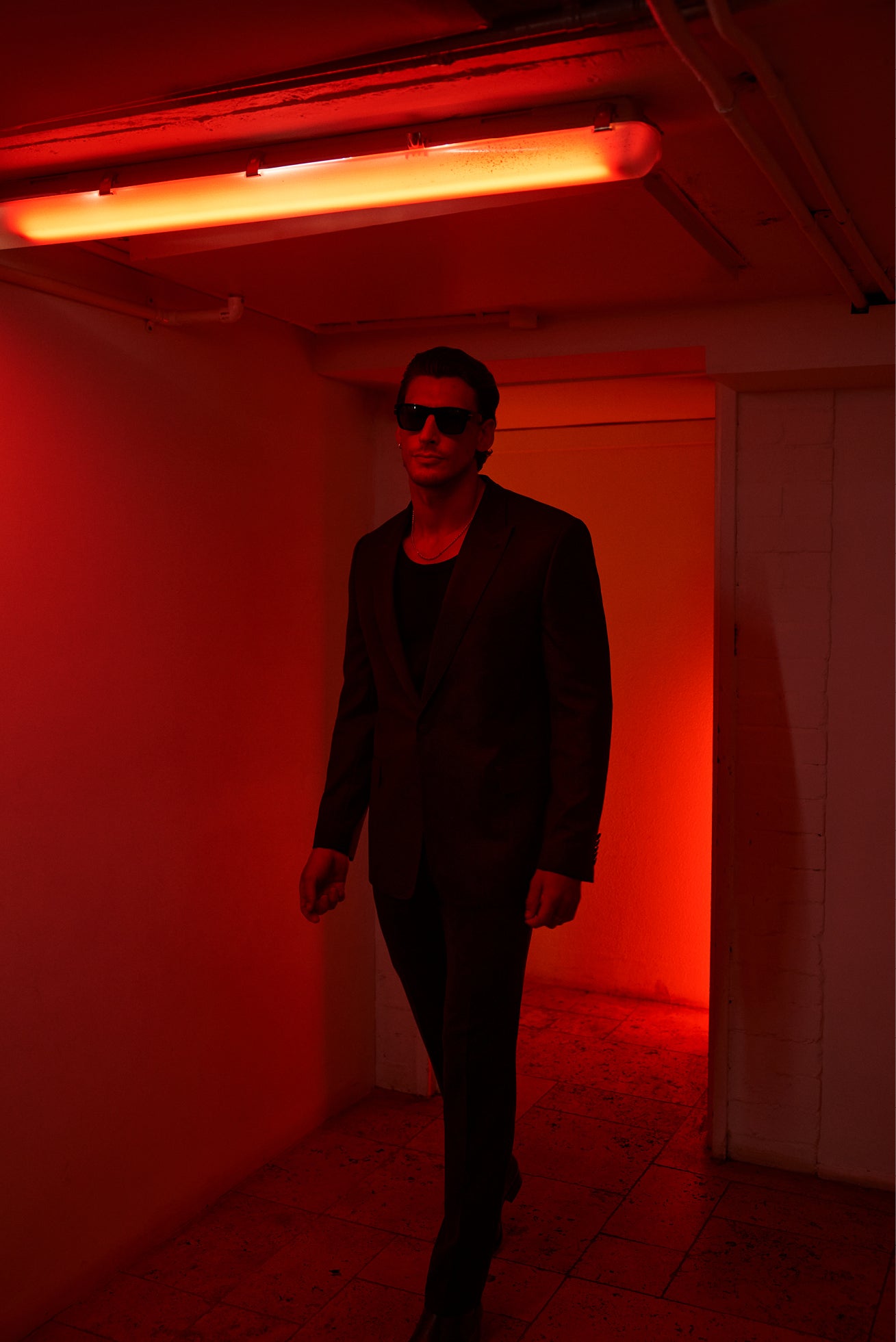 As we move on to Busby’s Bar, Don styles a black suit with a simple singlet and black sunglasses. It’s a classic, yet striking look reminiscent of what he might wear at a gig, or when shooting a music video.