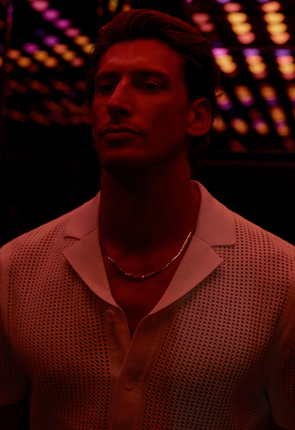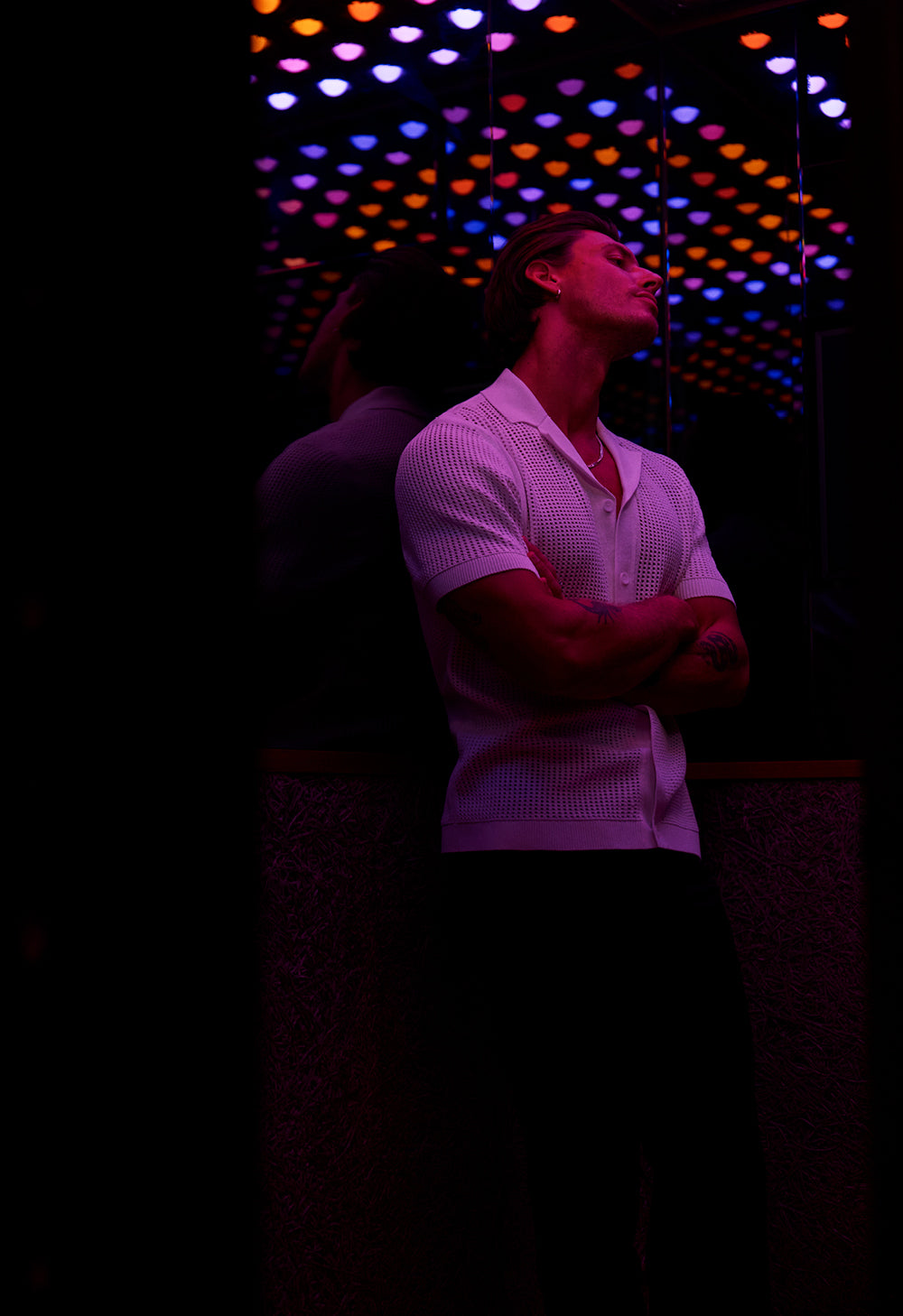 The Sydney-based musician is spending the day with CALIBRE, and from the moment he walks into the room, his presence is commanding. From his 6’5” frame, to his tattoos and combed back hair, he looks every bit the part of a frontman. Whether he’s sporting a denim shirt and jeans, or sheer, knit shirt, Don is unmissable.