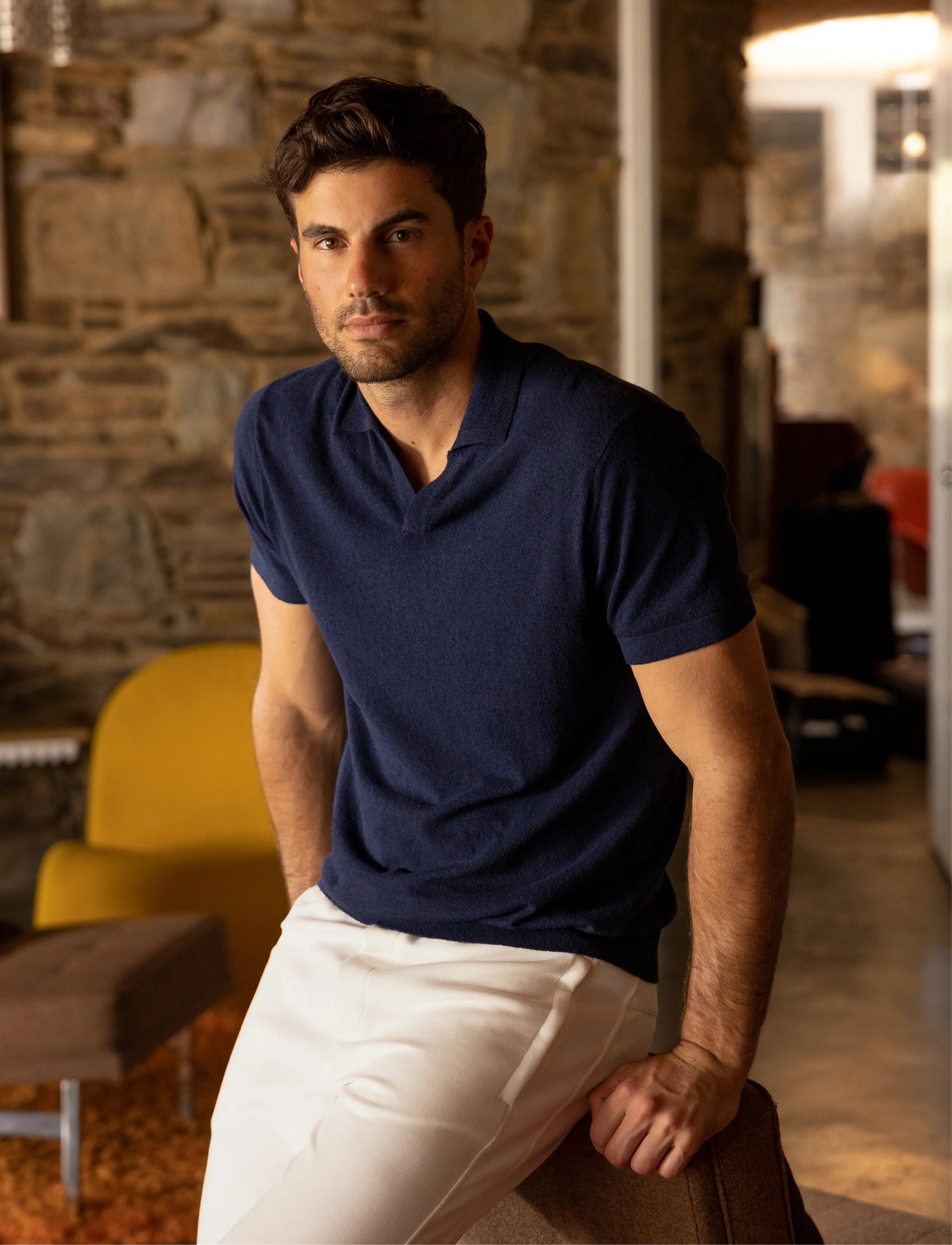 Amp up your style with new and energised colourways. Rich chocolate, caramel and ochre tones punctuate the collection, while deep green and navy hues offer a sense of distinctive sophistication. Explore new terrain with accented fabrics, and new, unmatched wardrobe additions. Breathe life into your wardrobe with eccentric colour and texture. Paying tribute to a known favourite, this collection has reinvented the classic polo from a functional staple, into an eye-catching piece. Make an impact and wear with trousers on a night out, under your blazer for cocktails, or with jeans for off-duty weekend style.