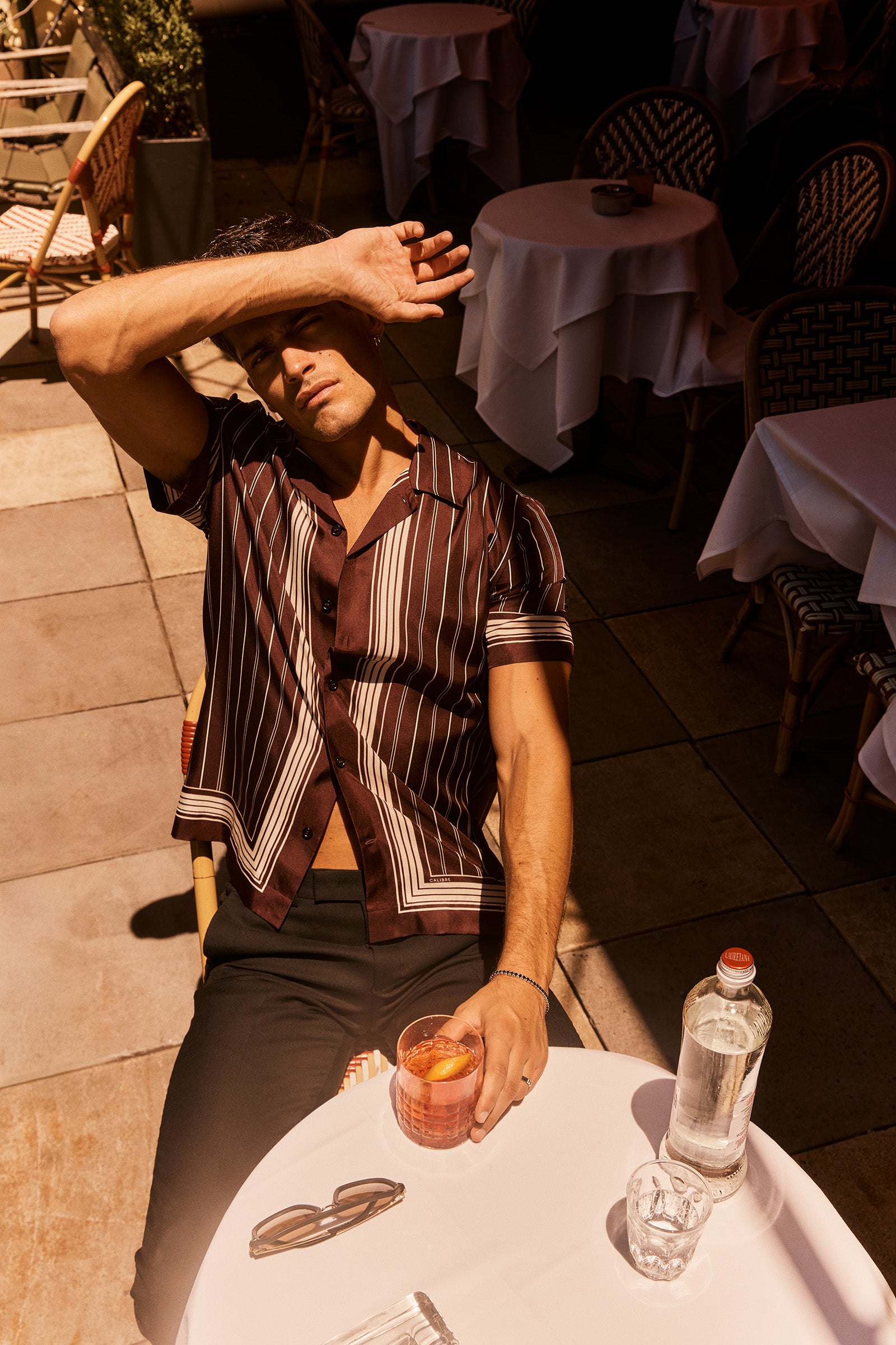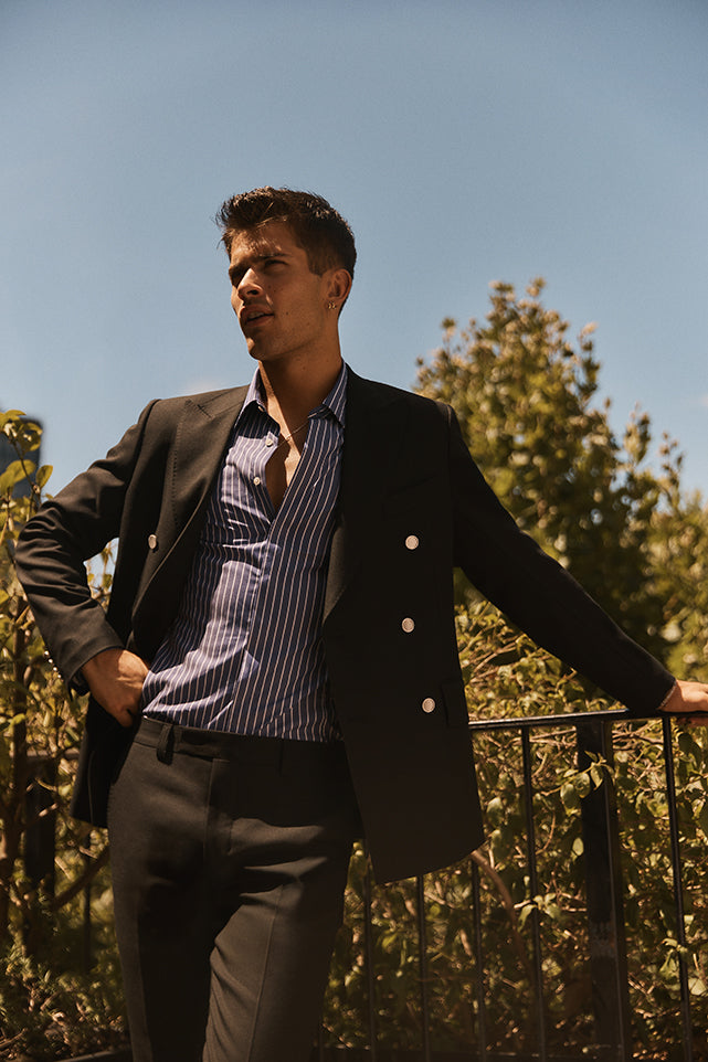 The sound of clinking glass, wine poured a little too generously. Stripes that shift with movement, tailoring relaxed just enough to belong wherever the evening leads. A collection felt in moments, worn in pieces.