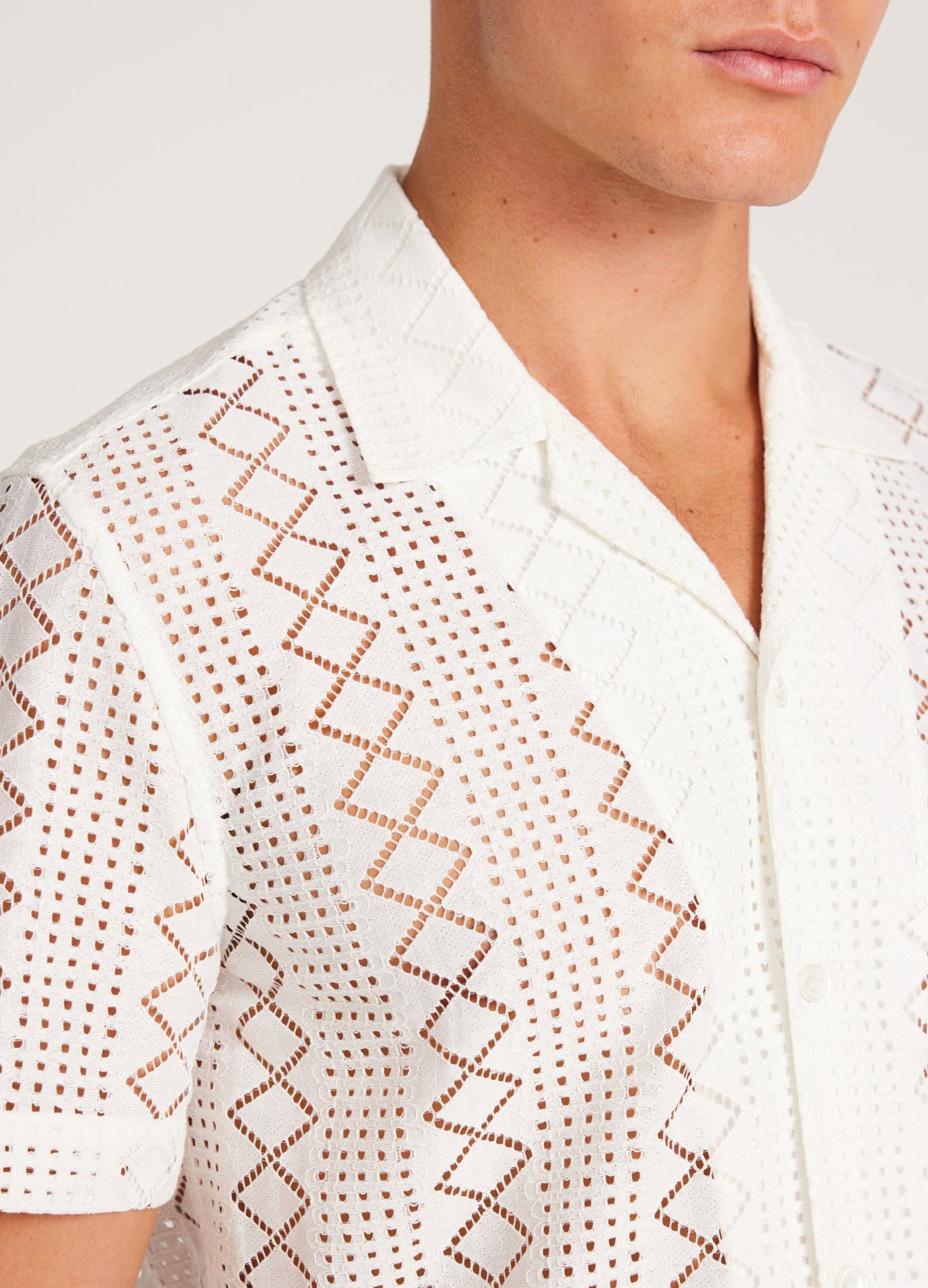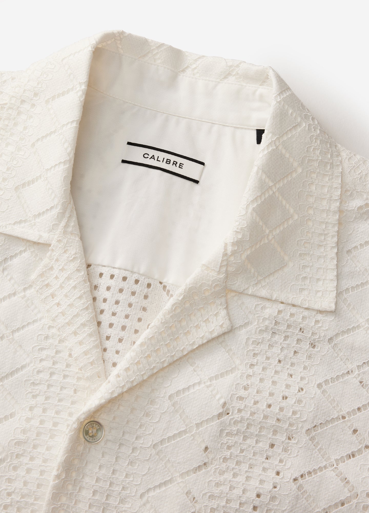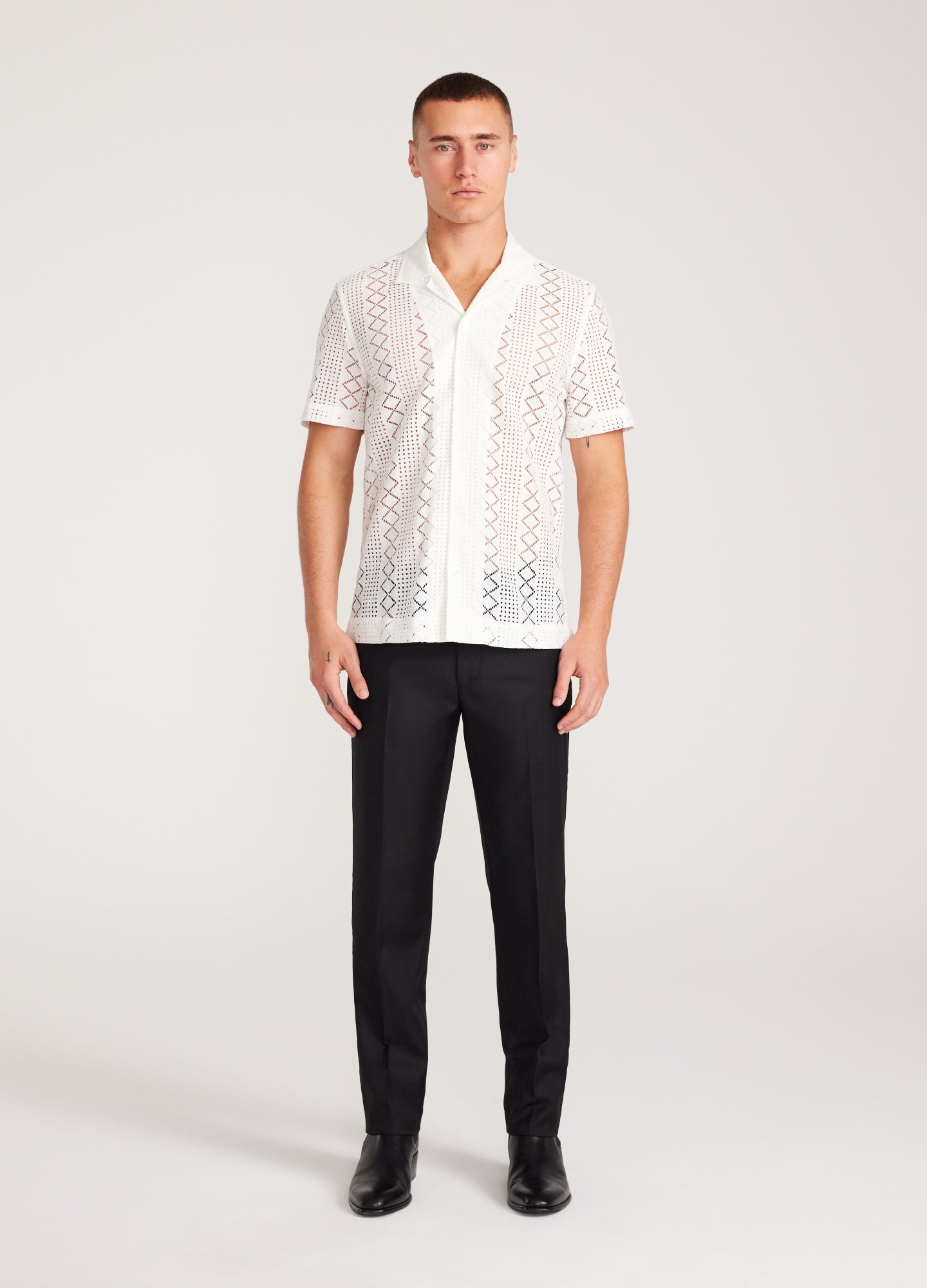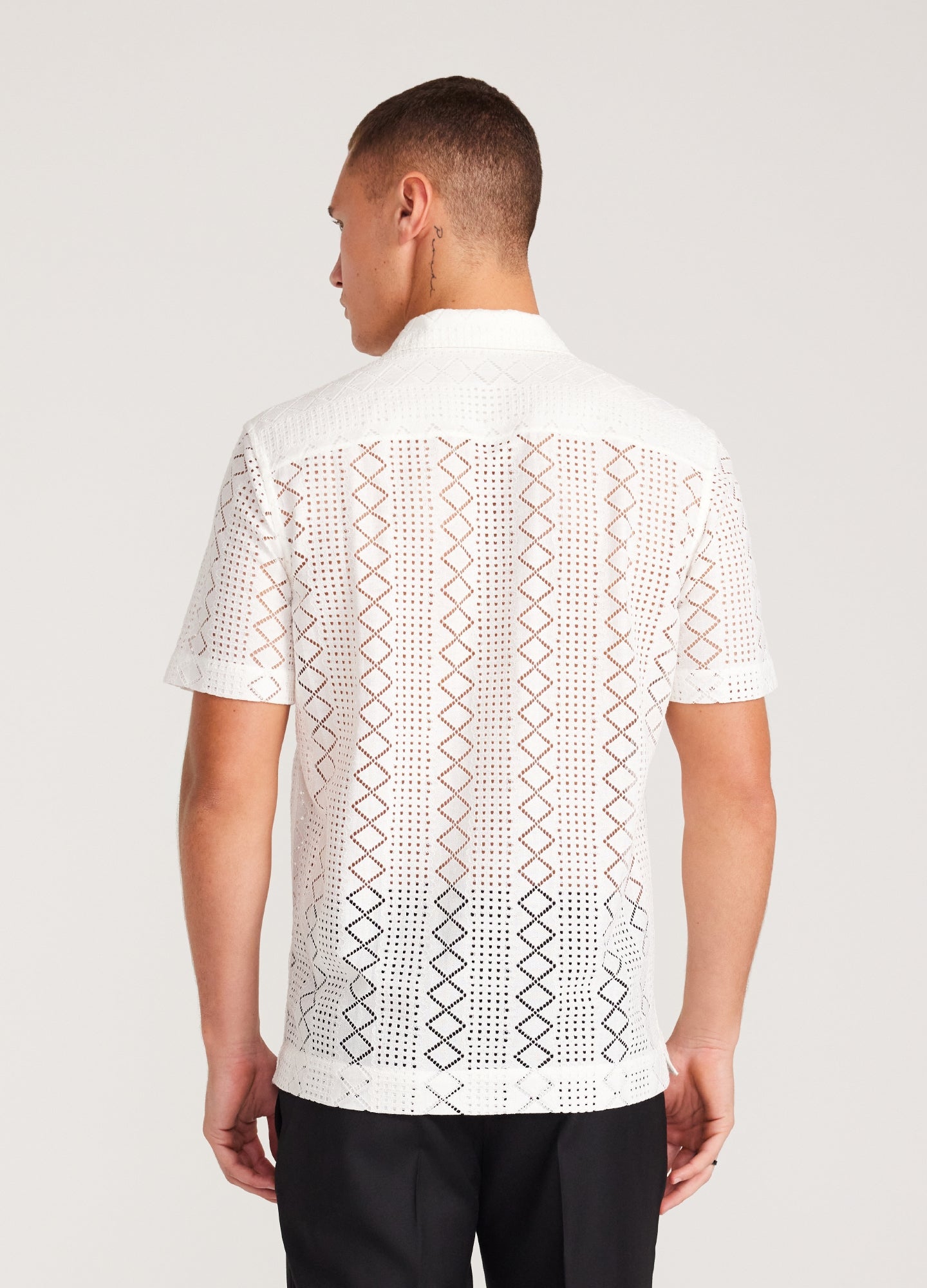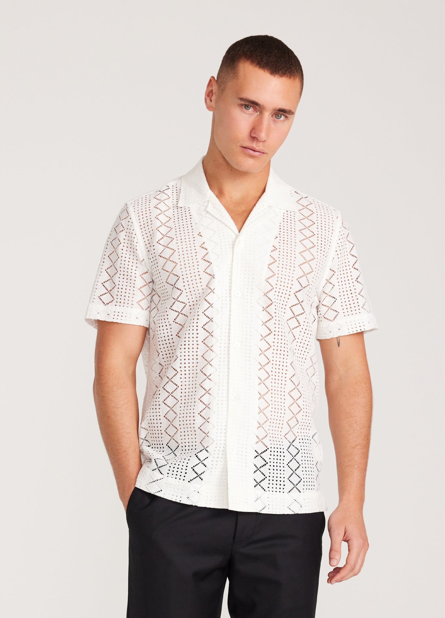 The Geometric Lace Short Sleeve shirt is constructed from lace with an open camp collar neck. Pairing perfectly with our tailored trousers or linen drawstring pants, it can be dressed up or down with ease.