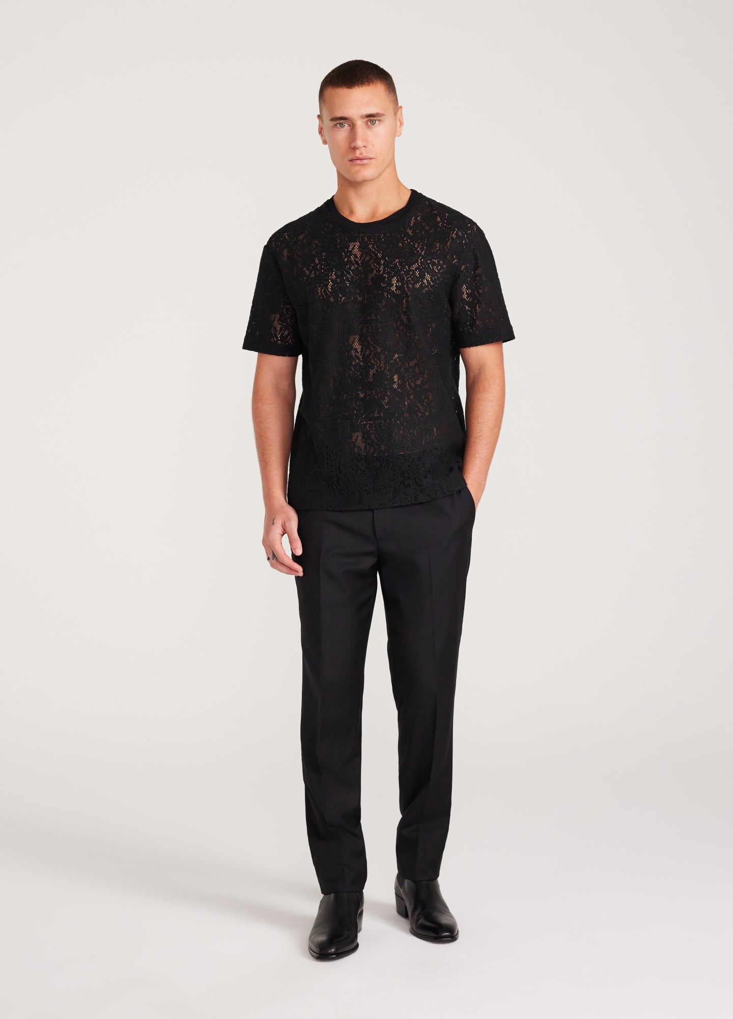 A textured take on the classic t-shirt. Crafted with a modern lace fabric from Japan, the Heavy Lace T-shirt works just as well dressed up with a blazer as it does with our bleached jeans.