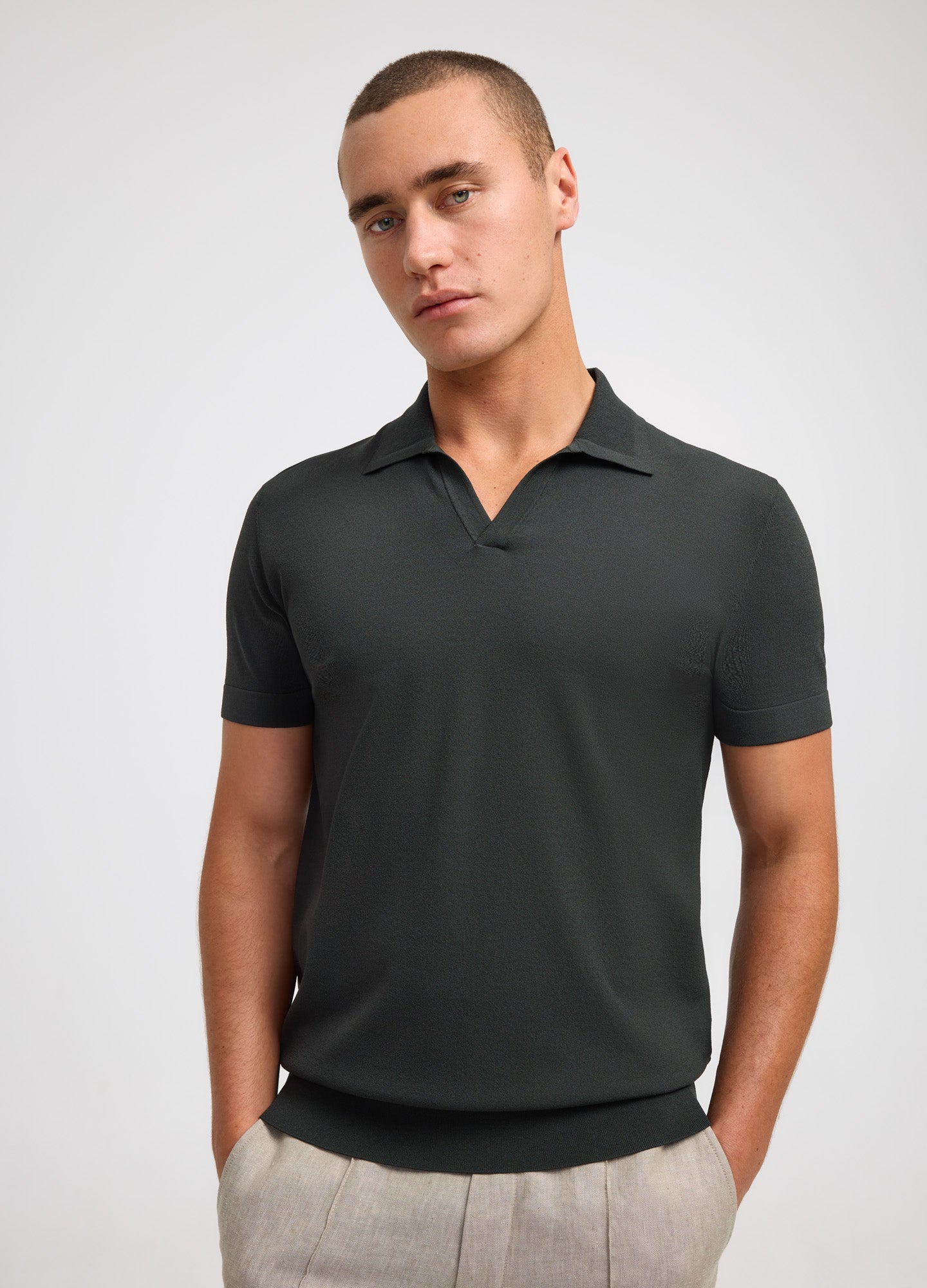 The Rib Collar Tech Knit Polo seamlessly transitions from day to night. Layer it underneath a suit for a smart, workwear outfit and pair it with slim black jeans and sneakers for an after-dark look.